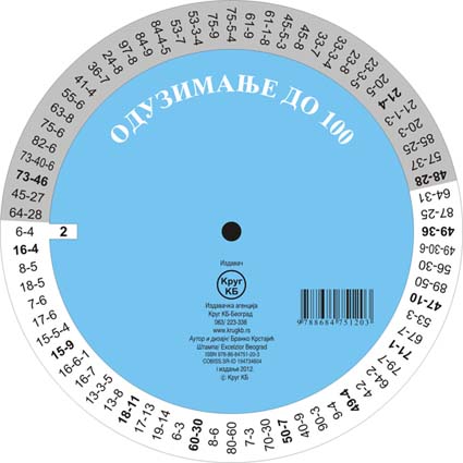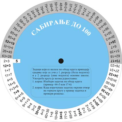 Круг "Сабирање и одузимање до 100" конструисан је тако да деца савладају операције сабирања и одузимања бројева до 100. Предња страна круга омогућава да деца вежбају сабирање до 100 а задња страна омогућава вежбање одузимања до 100. Круг је дупли, димензија Ø 165 mm.